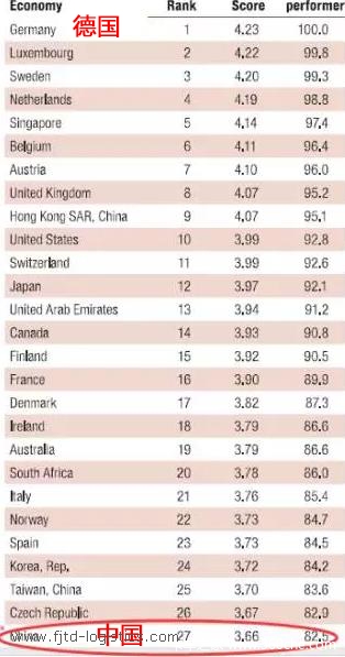 2、德国连续三届蝉联榜首,中国27位
