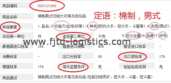 1)HS商品编码 6201121000:机织/梭织棉制男羽绒大衣等及类似品