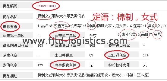 申报要素:织造方法(机织/梭织)、种类(羽绒服)、类别(女式)、成分含量(比如80%棉)、品牌、货号。法定第一单位:件,法定第二单位:千克。