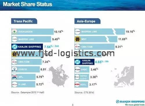 据咨询机构Alphaliner称,韩进海运占美国东北部集装箱运输业务的7%,即涉及到数百亿美元。此外,韩进服务35个国家的60条航线,连接全球逾90个主要港口和6000个目的地。