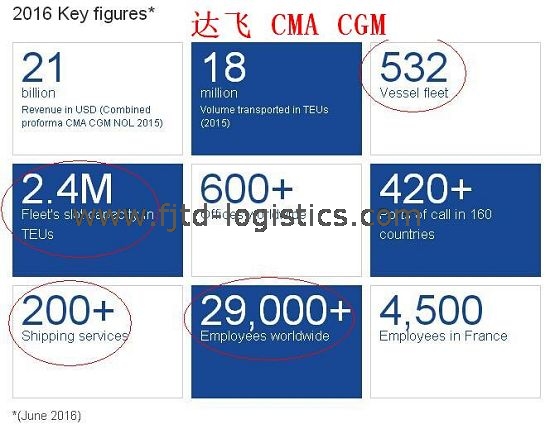 截止2016年6月,达飞集团在全球运营的船队有532艘,航线200多条,运力240万TEU(马士基340万TEU,MSC 260万TEU),覆盖160个国家(地区)的420多个港口,全球雇员2.9万多。