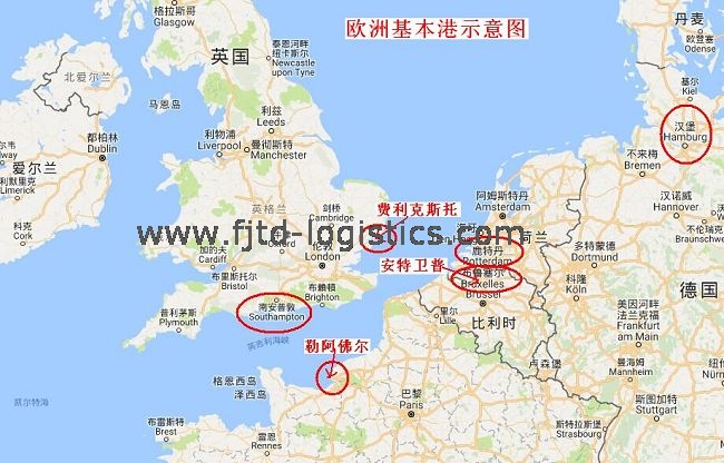 欧洲的基本港主要有6个:荷兰的Rotterdam鹿特丹;德国的Hamburg汉堡;比利时的Antwerp安特卫普;法国的Le Havre勒阿佛尔;和英国的Felixstowe费利克斯托以及Southampton南安普顿。