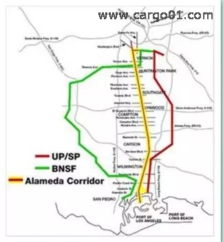 洛杉矶港原有的海铁联运设施是由两家知名的美国铁路公司运营的。一是北伯灵顿圣塔菲铁路公司(BNSF),通常美国同行把这家公司称为西部铁路公司,这家公司的货运版图主要集中在美国的中部和西部;另一个是联合太平洋铁路运输公司(UP)。这两家铁路公司在该区原有四条单向铁路引入港口,他们采用的重载列车最长可达2.5公里,四条铁路与城市道路形成200个平面交汇道口,每天约有35列火车,以32公里/小时的时速通过这些道口。这种局面如不改善,港口与城市的矛盾将不堪设想。
