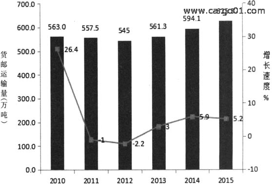 受欧债危机以及国际经济不景气的影响,2011年和2012年中国航空货运量均有小幅下降,2011年~2015年期间总体呈现出“缓中趋稳、稳中有增”的趋势。交通运输部《2015年交通运输行业发展统计公报》显示,2015年全国民航完成货邮运输量625.3万吨,货邮周转量207.27亿吨公里,分别比上年增长5.3%和10.9%。2015年全国民航运输机场货邮吞吐量较上年增长3.9%,共计完成1409.4万吨。[3]2010年~2015年民航货邮运输量详见图1。