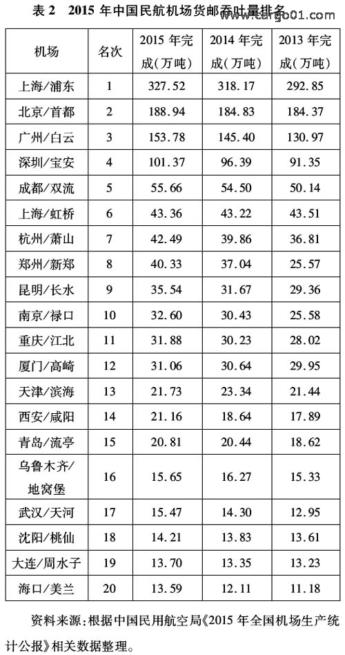 近年来,民航局和各级政府进一步加快航空物流基础设施建设,中国机场数量不断增加,机场规模不断扩张。2010年,机场系统完成固定资产投资总额441.5亿元。2013年,机场系统完成的固定资产投资总额达到507.5亿元。截止到2015年,我国大陆共有民用航空机场210个,其中定期航班通航机场206个,定期航班通航城市204个[4]。机场货邮吞吐量逐步集中于少数机场,上海、北京和广州三大城市机场的枢纽作用已日益显现。2015年,共51个机场的年货邮吞吐量达万吨以上,其货邮吞吐量与全国机场货邮吞吐量相比,占比达到98.4%,北京、上海和广州机场的货邮吞吐量占比达到50.9%。其中,上海浦东国际机场的货运吞吐量位居全球第三位。2015年中国民航机场货邮吞吐量排名见表2。