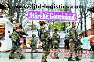当地时间20115年11月25日,法国巴黎,军警驻守香榭丽舍大街圣诞市场。巴黎这处原本红火的圣诞市场,显得有些冷清。