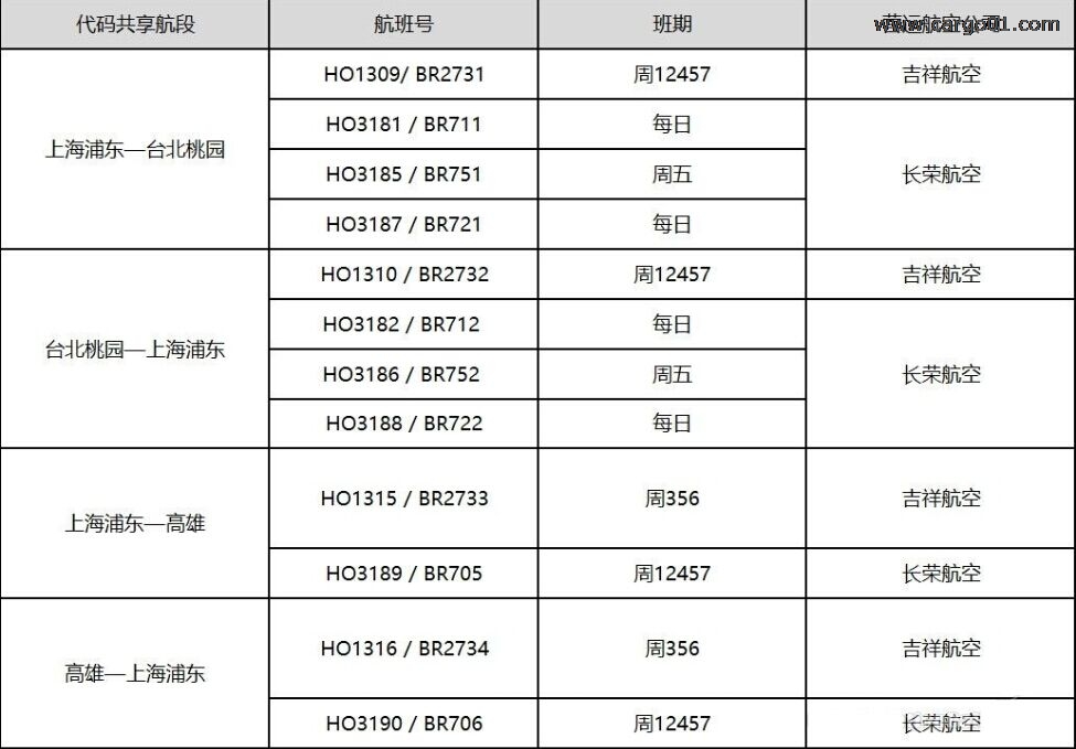 此次吉祥航空与长荣航空在上海浦东—台北桃园和上海浦东—高雄航线的代号共享合作具体如下: